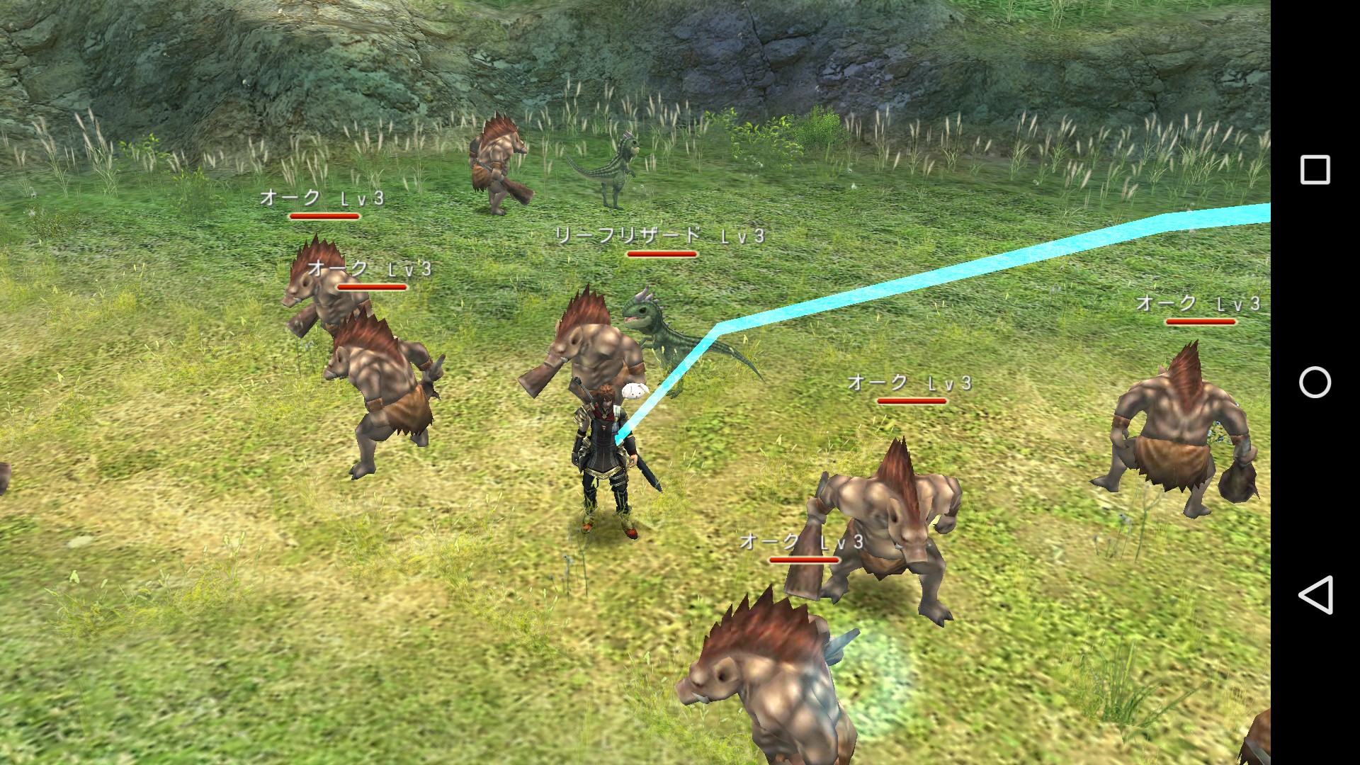 攻撃や回避のアクションは右下での発動です。攻撃を行いたいときは敵の近くへ行き、「ATTACK」ボタンを押しましょう。ノンターゲティング式なので、