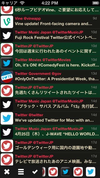 アプリを立ち上げると最初にアカウントを接続するポップアップが表示されます。アカウントとパスワードを入力して、Twitterにログインしましょう。トップメニューがタイムラインになっています。投稿された文章や写真すべてが表示されるタイムライン以外に、最初の1文だけが表示されるタイムラインもあるので、全体をざっくり確認したいという人に好評です。