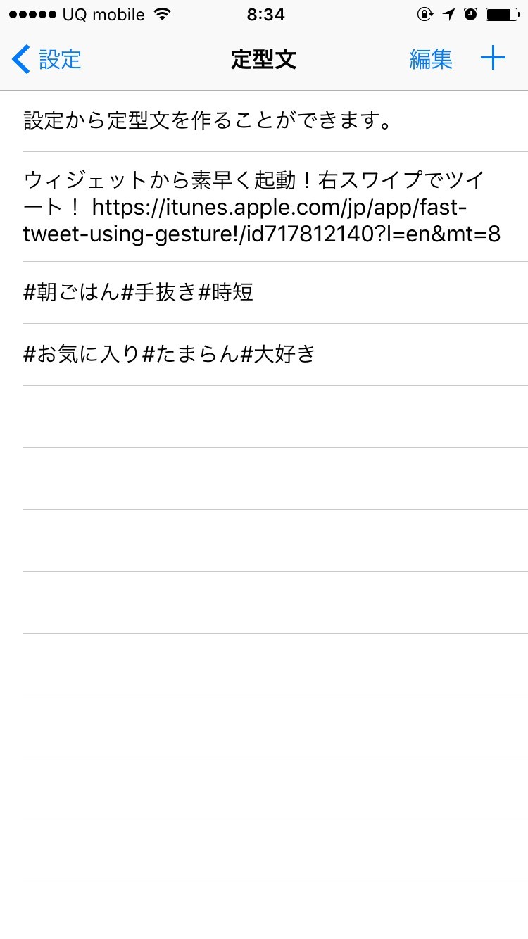 ・定型文にお気に入りのハッシュタグ(#)などを投稿して、簡単投稿!定型文は複数登録可能です。