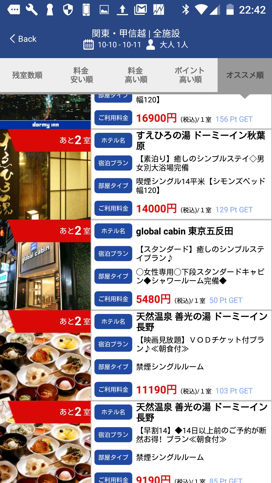 検索結果は空室数順、料金順、ポイント数順、おすすめ順に切り替えOK。