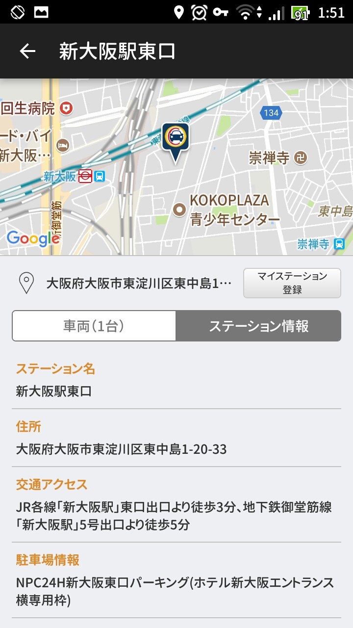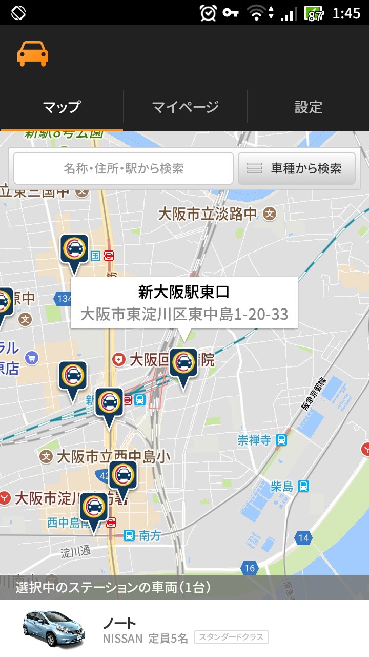 例えば駅名で検索すればその付近のステーションが表示され、タッチしてマップで確認すればそのステーションにある車が確認できるようになっています。