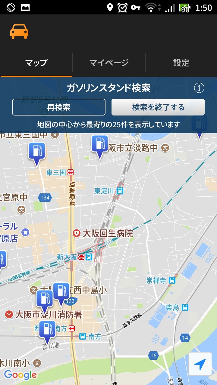 現在地を中心としたGoogleマップが表示され、画面上部にはマップ、マイページ、設定の三つのタブ。そして検索ボックスが配置されています。
