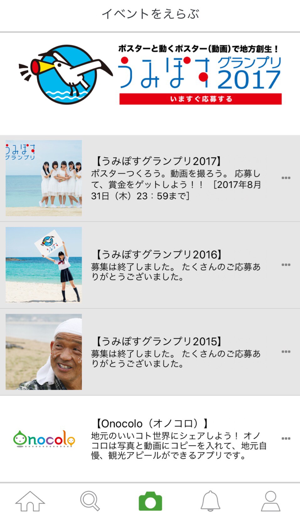 「カメラアイコン」をタップすると、このような画面が表示されます。「うみぽすグランプリ」が開催されている期間は、この画面から選ぶだけで簡単に応募ができます。今は「うみぽすグランプリ」の期間外なので、一番下の地元のいいところを紹介する「Onocolo(オノコロ)」をタップして投稿します。