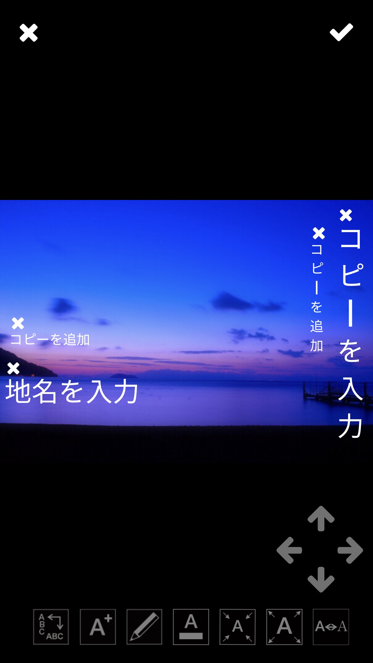 今回は、左下の「写真アイコン」をタップするとアルバムから写真を選びました。このアプリで写真を選ぶと、このように写真に文字を入れることができ、写真をポスターにして投稿することができます。早速、キャッチコピーを入れていきます。