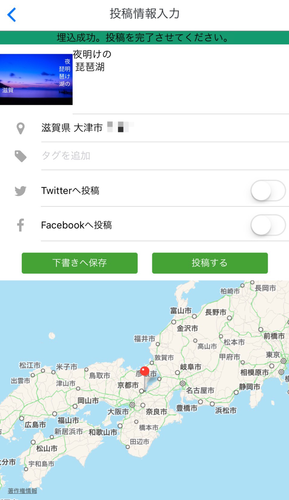 「Twitterへ投稿」や「facebookへ投稿」をオンにすると、投稿と一緒にTwitterやfacebookに登録をすることができます。