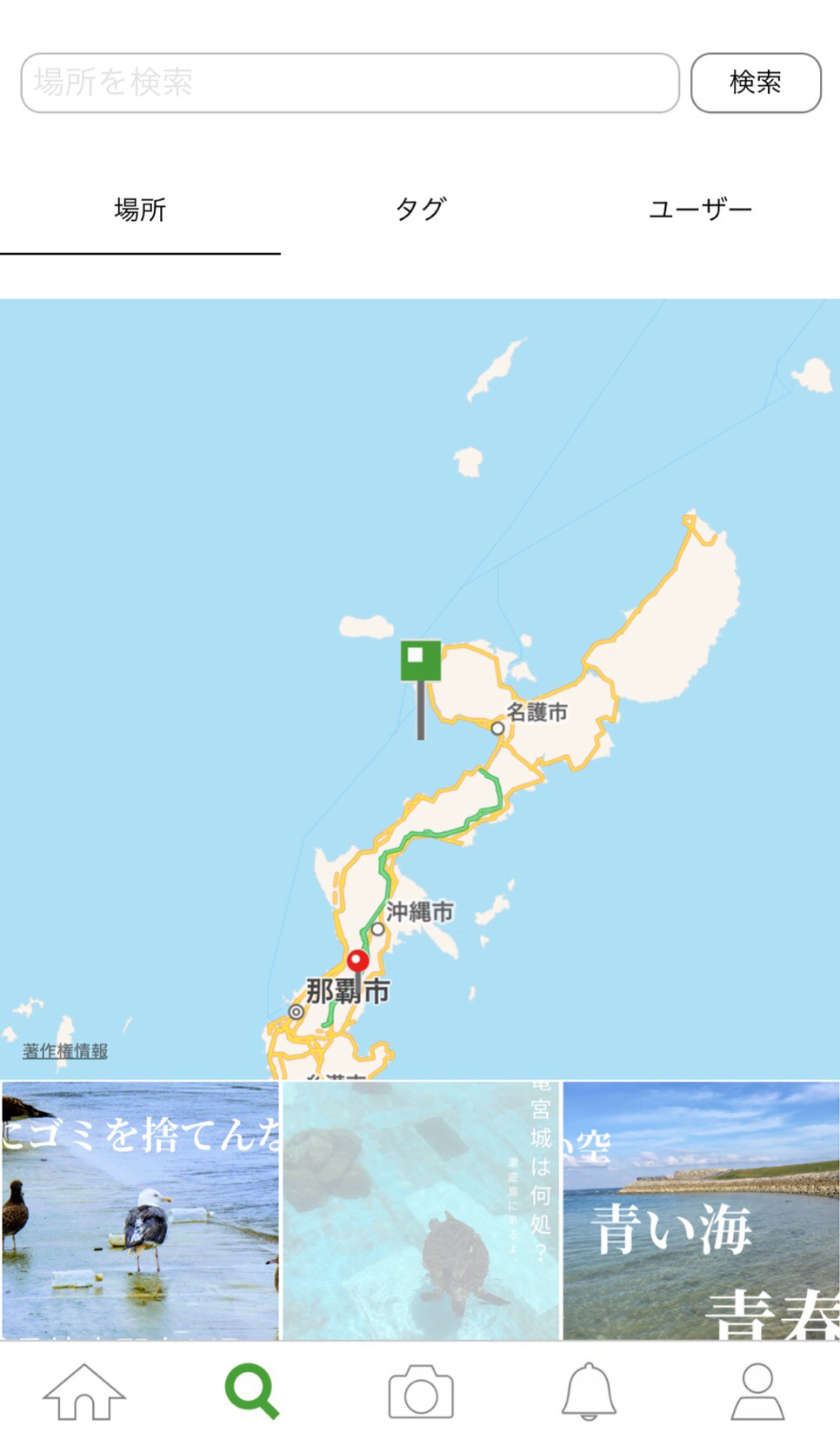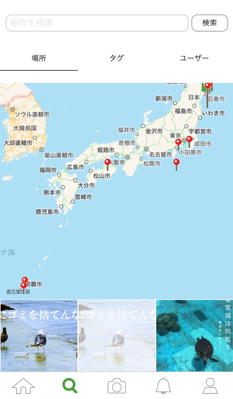 「虫めがねアイコン」をタップすると、このような画面が表示されます。この画面では、地名を入力して投稿を検索したり、地図のピン部分をタップして検索したり、タグやユーザーで検索することもできます。下部分に表示されている画像をスワイプして、気になった投稿をタップしてもよいですね。