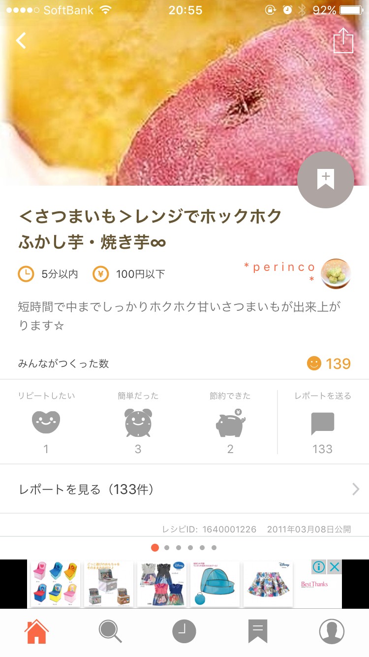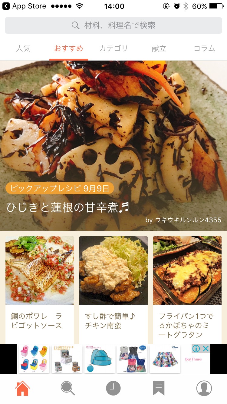 レシピを見ていて、気になるものは、お気に入り登録しちゃいましょう。レシピの写真右下にリボンのようなマークが表示されていますので、タッチしてみましょう。ただそれだけでお気に入りに追加されます。あとからそのレシピを見たい時は、アプリの下部に同じマークがあるので、それをタッチします。お気に入りは、自分でカテゴリを作成することもできます。自分が分かりやすく、使いやすいお気に入りにカスタマイズしちゃいましょう。