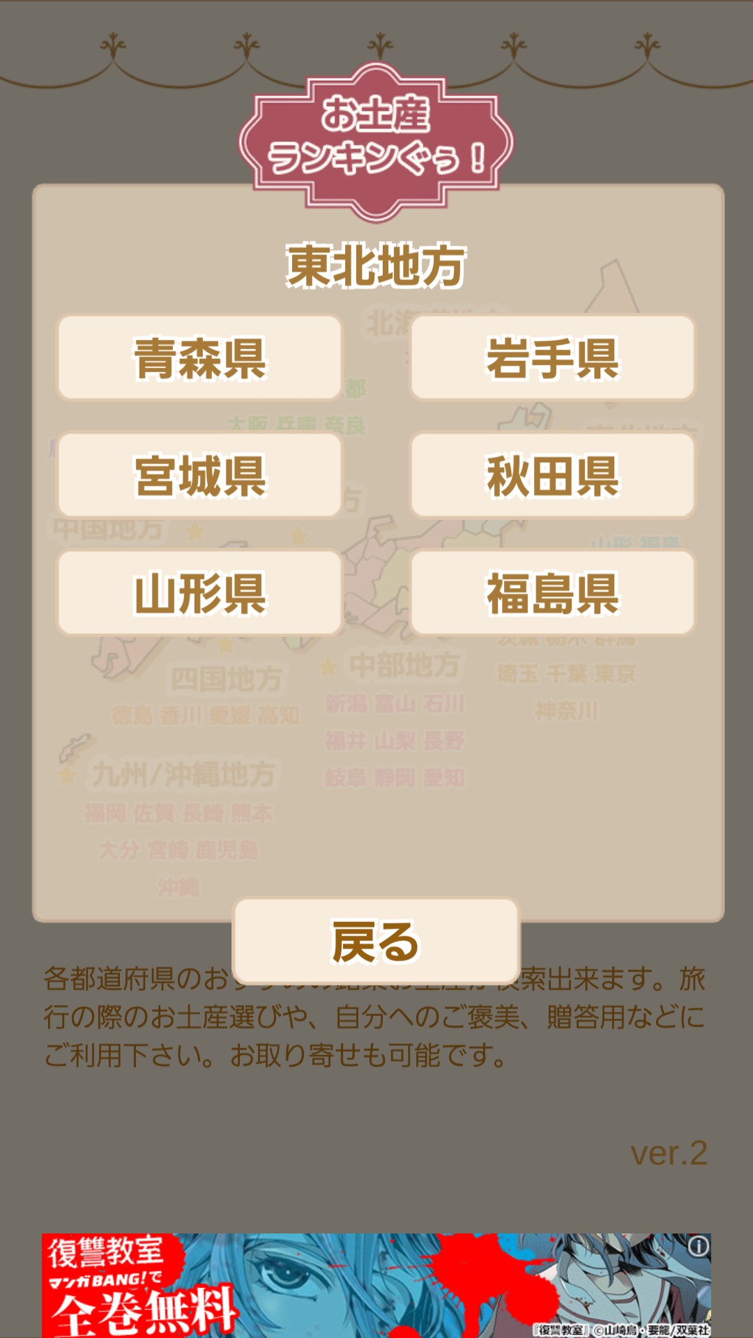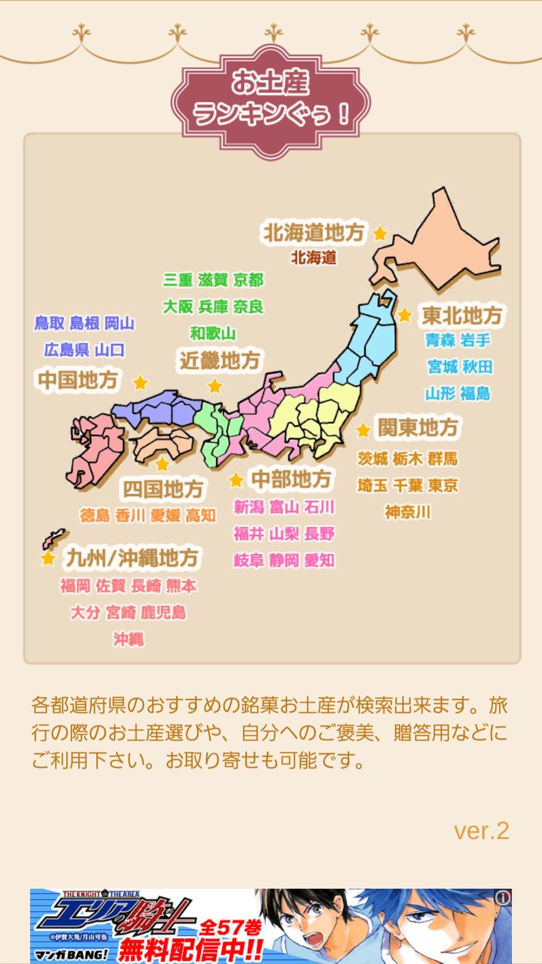 このアプリは地域と都道府県を選んでクリックするだけで、その都道府県で人気のお土産を見ることができる便利なアプリです。