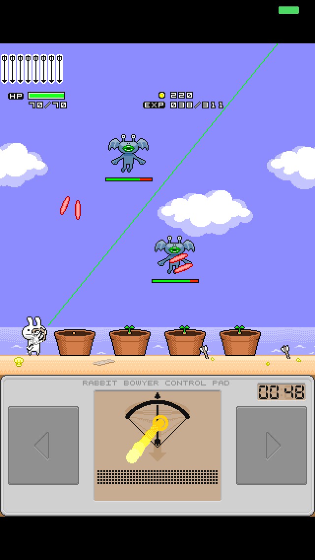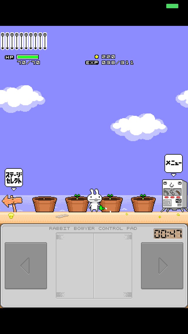 ステージセレクトボタンをタップすると、ゲームしたいステージを選択することができます。ステージクリアするごとに、どんどん選択ステージが拡大していくスタイルです。前述でも述べたように、ラビットの武器は弓矢となります。ここで感心させられるのは、矢は無限に打てるわけではないということです。
