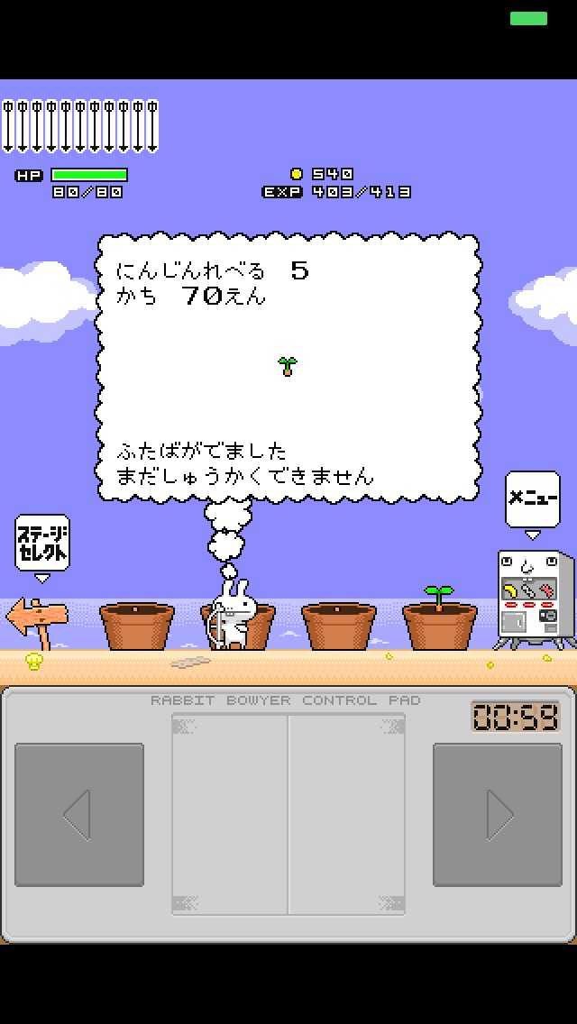 ゲームを進めると同時にラビットはニンジンを育てます。手間暇かけ、時間を追うにつれてニンジンは成長し、よりよいニンジンへと成長します。