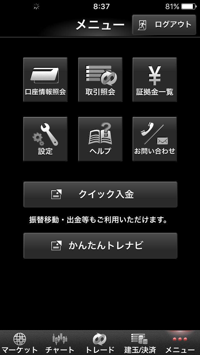 先ず、アプリを起動しますと、MENUの[マーケット][チャート][トレード][建玉/決済]