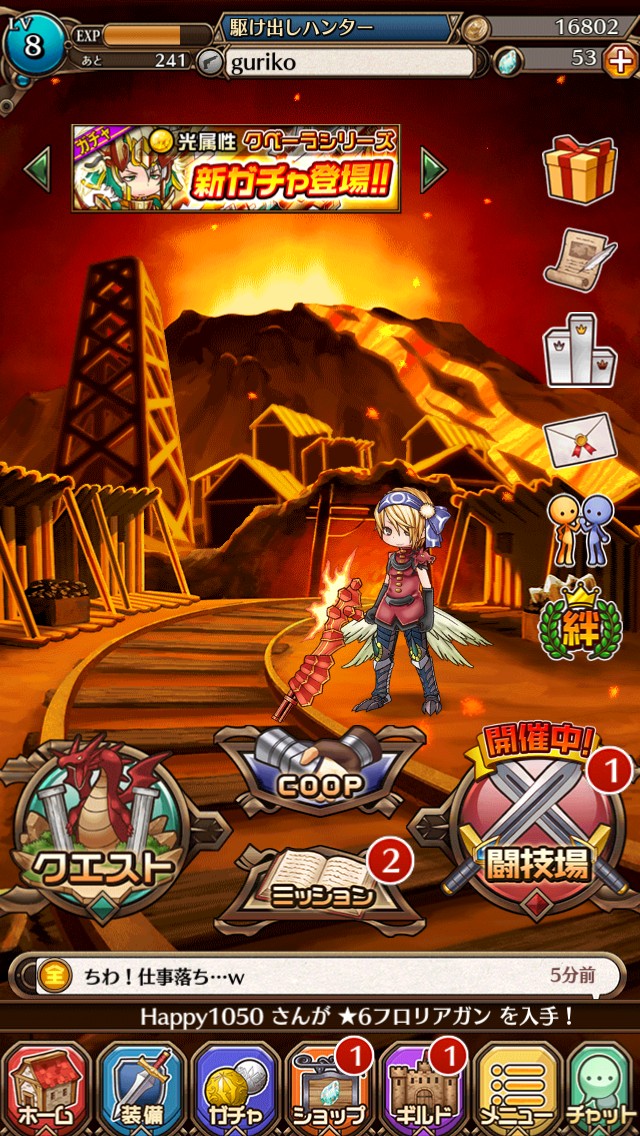 クエストを進めていくにつれて、ホームの背景も変化していきます。また、ホーム画面からは装備やガチャ、ショップなど、バトルRPGには欠かせない定番メニューのほか、前述でも述べましたギルドやチャットなども楽しむことができます!