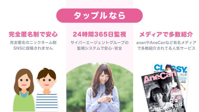 「タップル誕生」はサイバーエージェントが運営している、完全匿名のニックネーム制の出会いアプリです。匿名性が高いので、始めるのに抵抗が少ないためか、1日4,500人もが登録しているというユーザーの多さが特徴です。「趣味でつながる」がコンセプトで、始めに興味のある趣味項目を5つ選ぶシステムになっています。共通の趣味で相手が探せるので、会話も弾みやすく、気軽にやり取りができるので婚活というよりは友人探しや恋愛相手を探す目的で主に20代の若いユーザーが多いです。カジュアルな出会いの場と考えて、呼びやすいニックネームを設定すると良いでしょう。