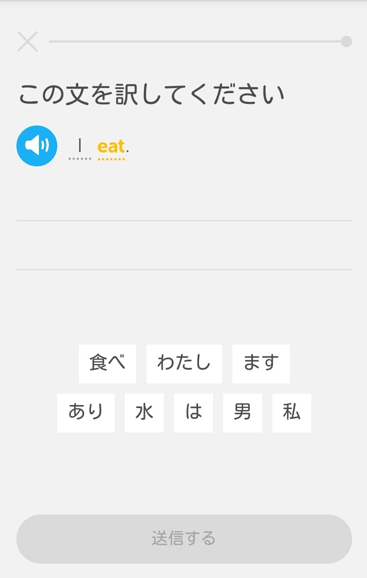 Duolingoで出題される主な問題は、4択/和訳/英訳/リスニング/スピーキング/ライティングです。