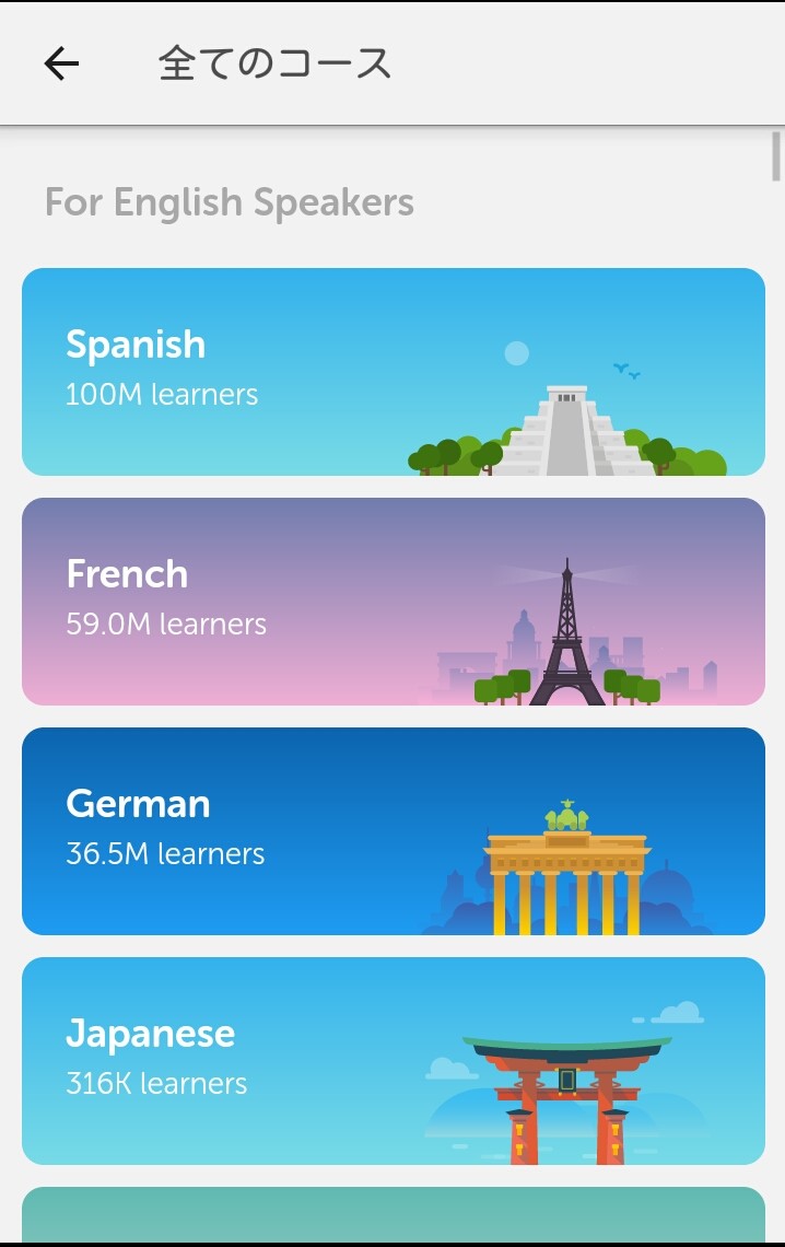 また、Duolingoの凄いところは英語だけではなく他の言語も学べるところです。