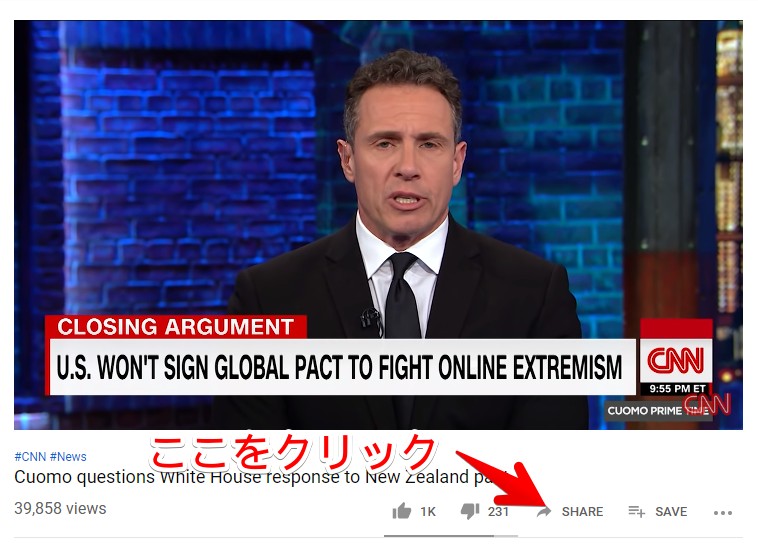 投稿したい動画のページを開いてSHAREボタンをクリックする