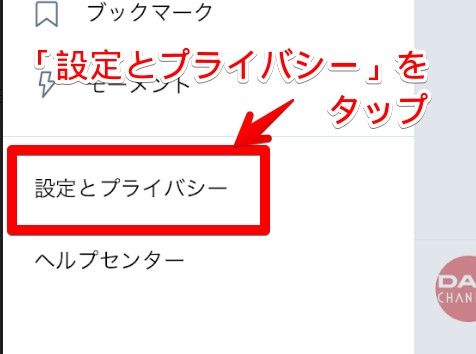 まずはアカウントのアイコンをタップし、メニューバーを表示します。一覧から「設定とプライバシー」を選び、次へ進みます。