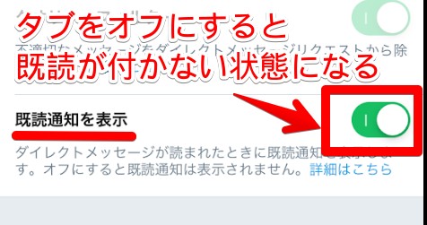 画面中央よりやや下あたりに、DMについて変更できる項目があります。中から「既読通知を表示」を確認し、右側にあるタブを切り替えましょう。