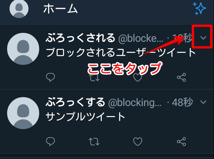 ブロックしたいユーザーのツイートの右上の矢印マークを押してください。