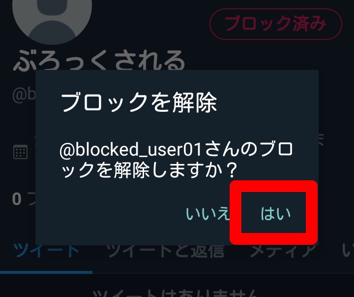 本当に解除するのか確認画面が出てくるので、OKを選択すればブロックの解除は完了です。