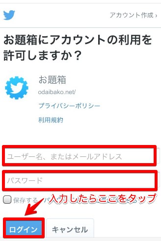Twitterのユーザー名やパスワードを入力し、「ログイン」をタップします。
