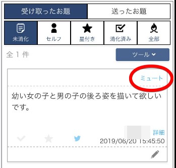 あまり気分の良くないお題を投稿され、見たくないときに隠してくれる機能です。一度ミュートして隠したお題は、再表示できないので注意が必要です。