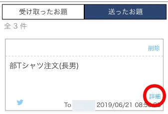 送ったお題の一覧には、送り先の名前も表示されていて、更に詳細をタップすると、投稿したお題箱に移動可能です。