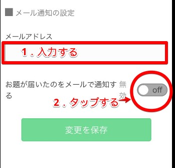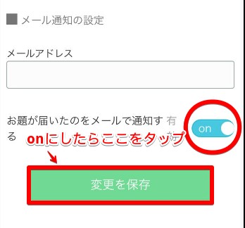 通知を受け取りたいメールアドレスを入力し、「お題が届いたのをメールで通知する」の右側にあるoffをタップします。