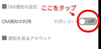 「DM通知の利用」の右側をタップし、on(利用する)にします。