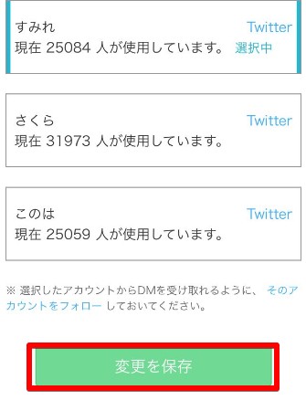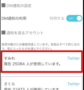 通知を送るアカウントを1つ選び選択します。どれを選んでも性能は変わりません。