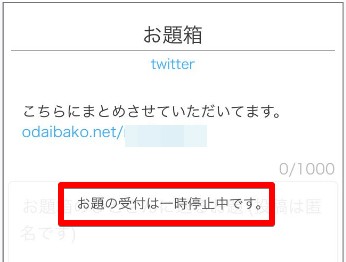 フォロワーから見たとき、お題箱のタイトルや説明文は変わりませんが、お題の内容を入力する位置に、「お題の受付は一時停止中です。」と表示されます。